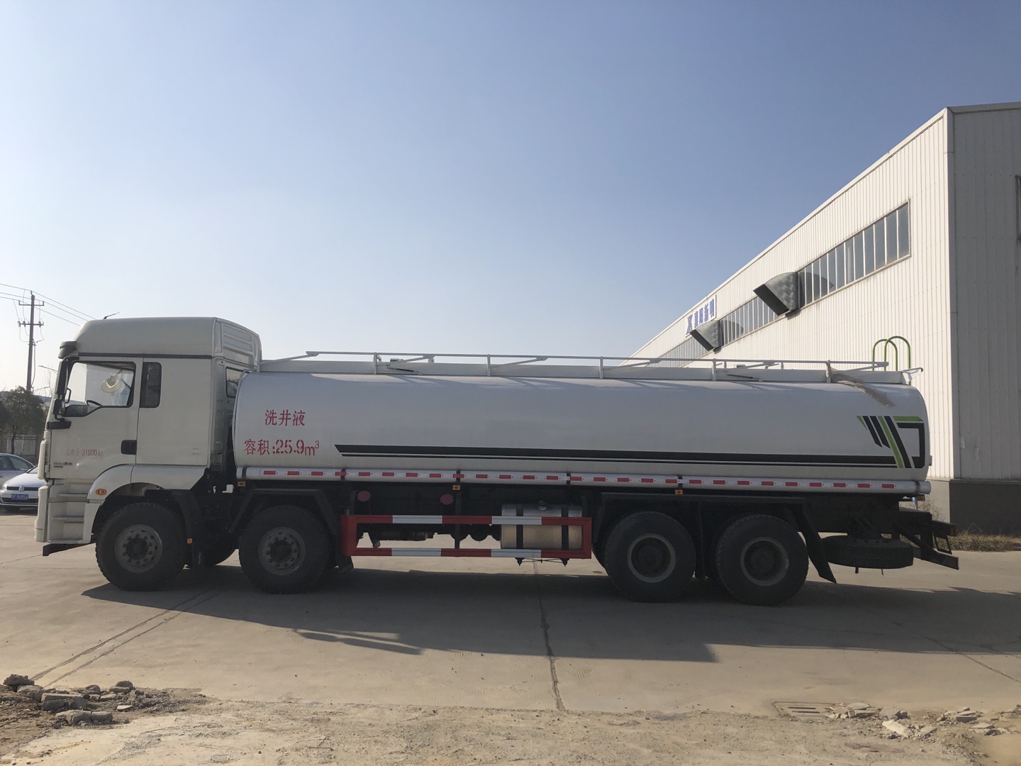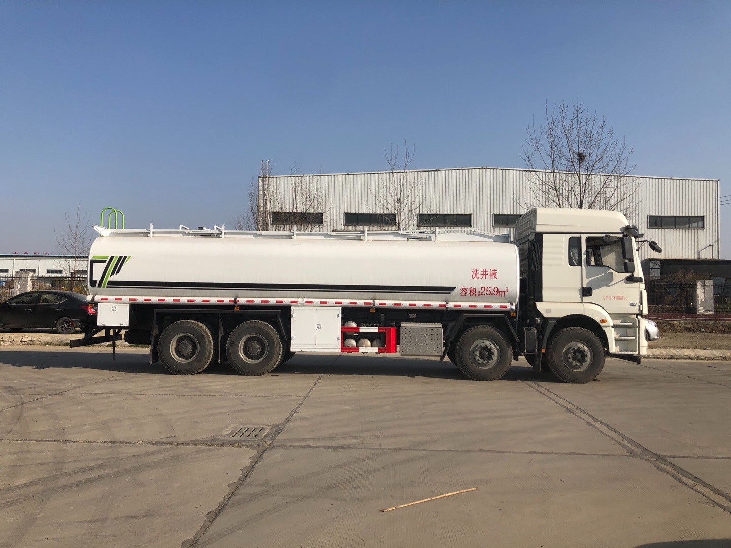 【Truck body configuration】 : effective volume of tank: 30m3, material adopts Q235, carbon steel steel tank 5mm thick, carbon steel head 5.5mm thick, partition 4mm thick, with 2 ordinary tank mouth, with 80-60 pump for pumping in and pumping out, 4 inch pipe, 3 inch outlet, all other accessories are carbon steel material.