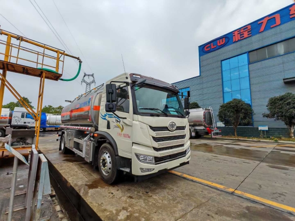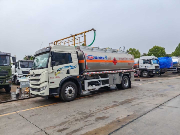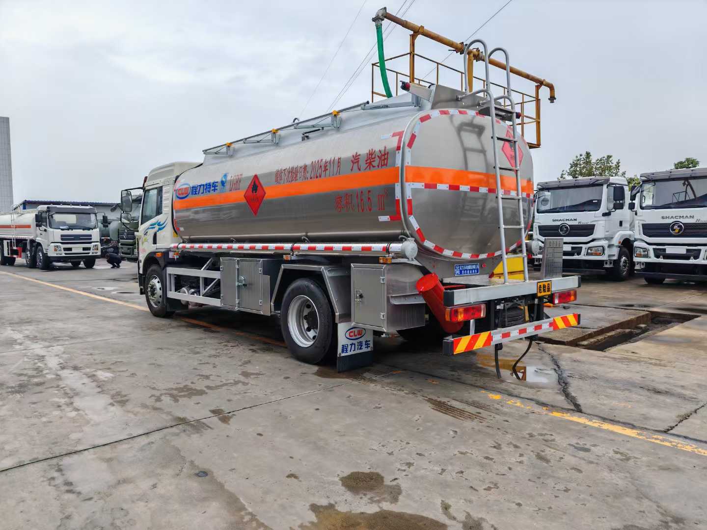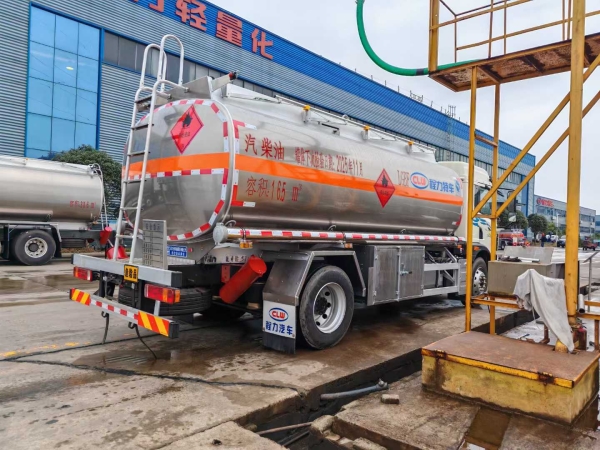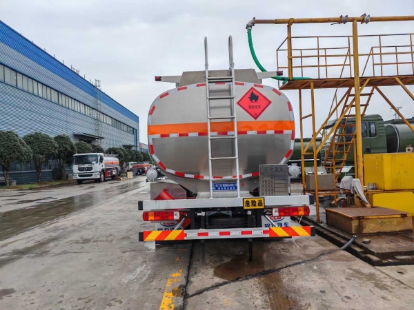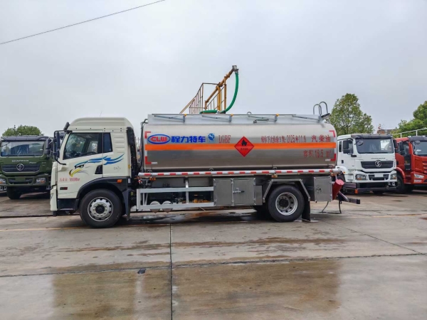 Effective volume of the tank: 16m3. material: aluminum alloy sheet. The tank body is 6mm thick, the head is 6mm thick, the partition is 6mm thick. Single compartment. The tank top has two European standard tank openings, 1 new type intelligent closed underwater valve, 1 set of bottom loading oil (oil discharge valve, oil vapor recovery, overflow detection rod, anti-static coil), equipped with 80-60 special oil pump (both pump in and pump out), after climbing ladder, manual guardrail, toolbox, rear bumper, side guardrail are all made of aluminum alloy sheet.