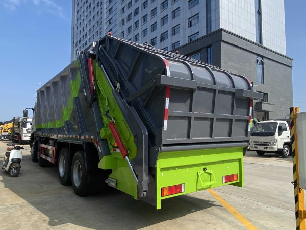 The net volume of the garbage compactor body is 36-40m3, the box is a curved box, the box around the frame reinforcement, strong bearing capacity, the whole car uses T700 high-strength wear-resistant plate, the box side 5 bottom 6 production, the filler side plate 6mm bottom 8mm thick, skateboard, slide 8mm thick, push and shovel cylinder conditioning treatment, the use of 5 levels of production, so that the shovel to minimize the space. Maximum box volume, more garbage loading! CAN bus smart screen operating system, with wireless remote control, the system program can be set on the smart screen according to the requirements of the user's use conditions, can set the automatic operation conversion time, throttle control size, with automatic fault detection, alarm prompt function, other standard.The gross vehicle weight of the garbage compactor truck is 31000kg.