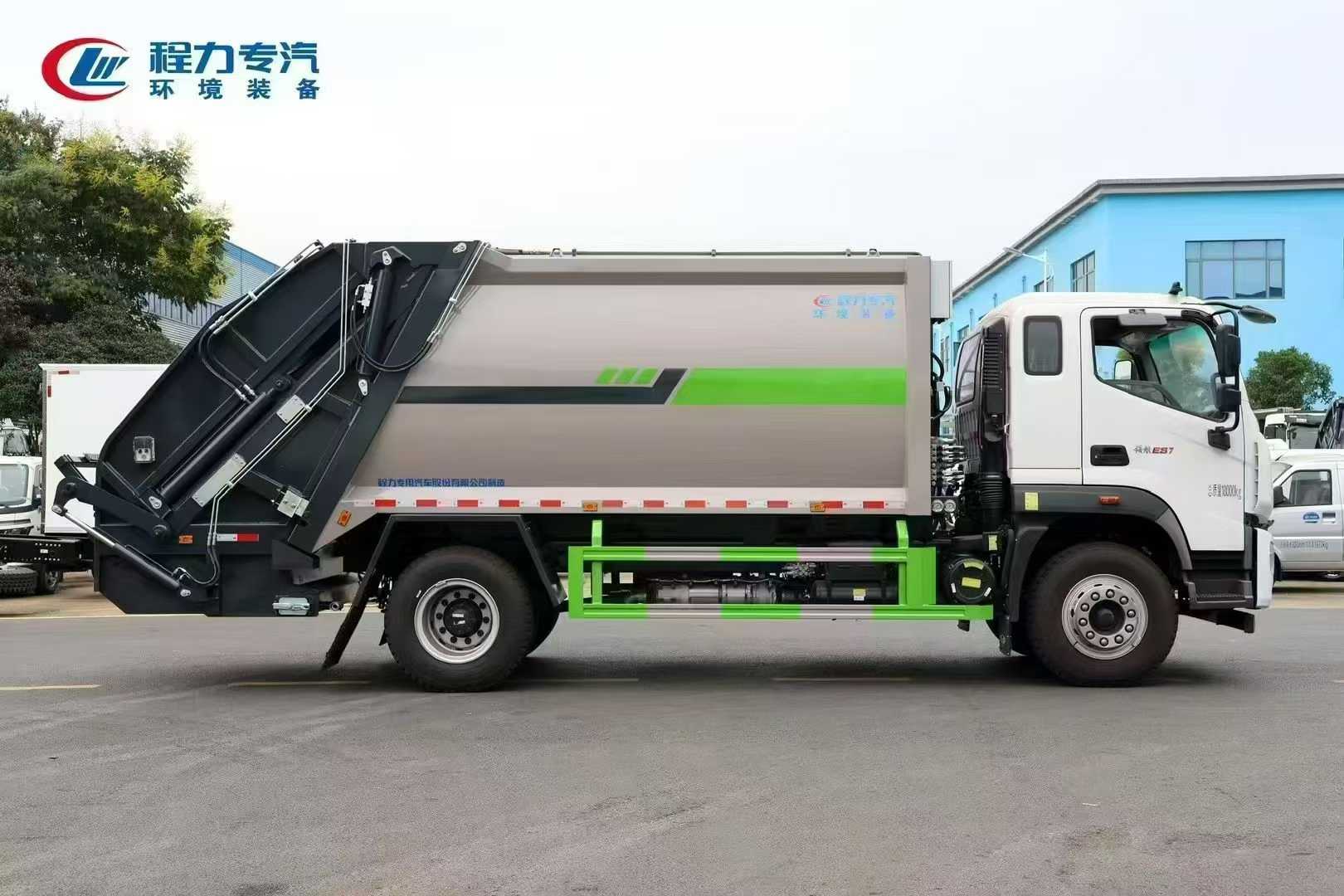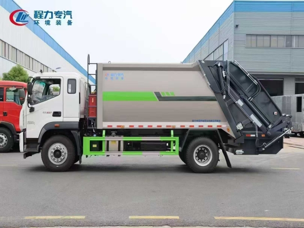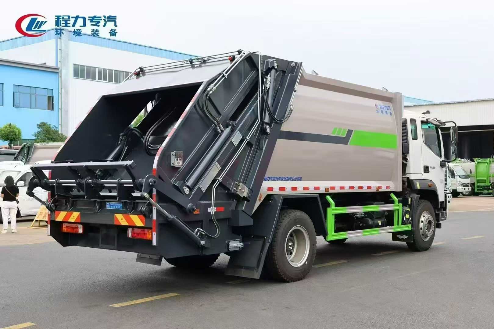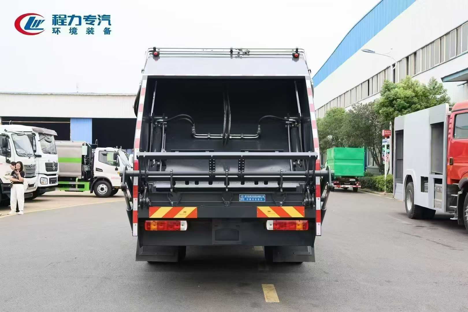 Garbage compactor truck body configuration: The body box is made of Q345, the filler and local parts are made of high-strength laser-cut T70 steel. The box volume is 14-16m3. The new type of crushable scraper. Externally mounted hydraulic cylinder slide plate. Arc-shaped push plate design. The pin shaft adopts 40cr heat treatment process, bidirectional pulsating compression function. The slide plate slide track is strengthened and reinforced. Well-known domestic and foreign brand hydraulic systems (Zhongmeiduolu valve, throttle valve, compaction valve, bidirectional balance valve). Ruichen iron shell high-pressure gear pump, Jiashan high-speed clutch, British Hylite sealing parts constant force cylinder. Large-capacity cooling hydraulic oil tank. Galvanized quenched pin shaft. Scraper oil cylinder adopts rod head oil inlet, optimizes the swing angle of the pipeline, improves the service life of the pipeline. Pure copper concave head grease nipple. Graphene nylon slider. Silicone corrosion-resistant sealing strip. Tianhe multi-layer steel wire high-pressure hose. Galvanized seamless steel pipe main oil circuit. Built-in stainless steel sewage filter screen. Galvanized bilateral sealing sewage outlet. Front and rear large-diameter sewage ball valves. CAN bus remote control for inside and outside of the vehicle. LED night operation lamp. Heightened feeding port. The vehicle adopts 8.8 or above high-strength self-locking bolt assembly process. Standard 120L and 240L flip bucket frame.