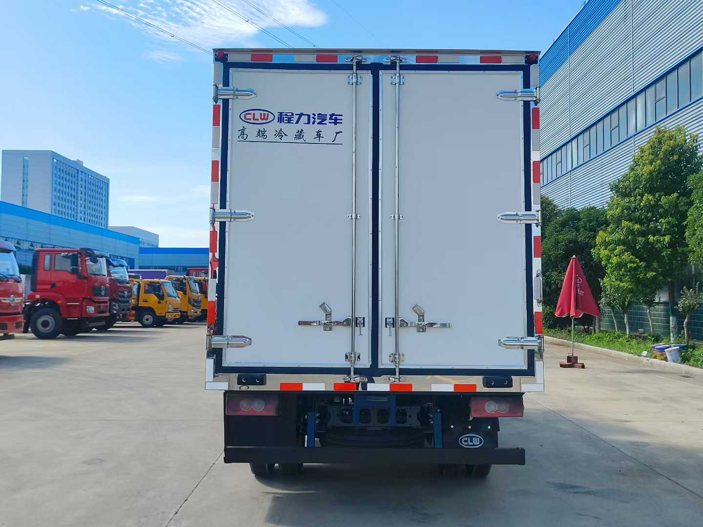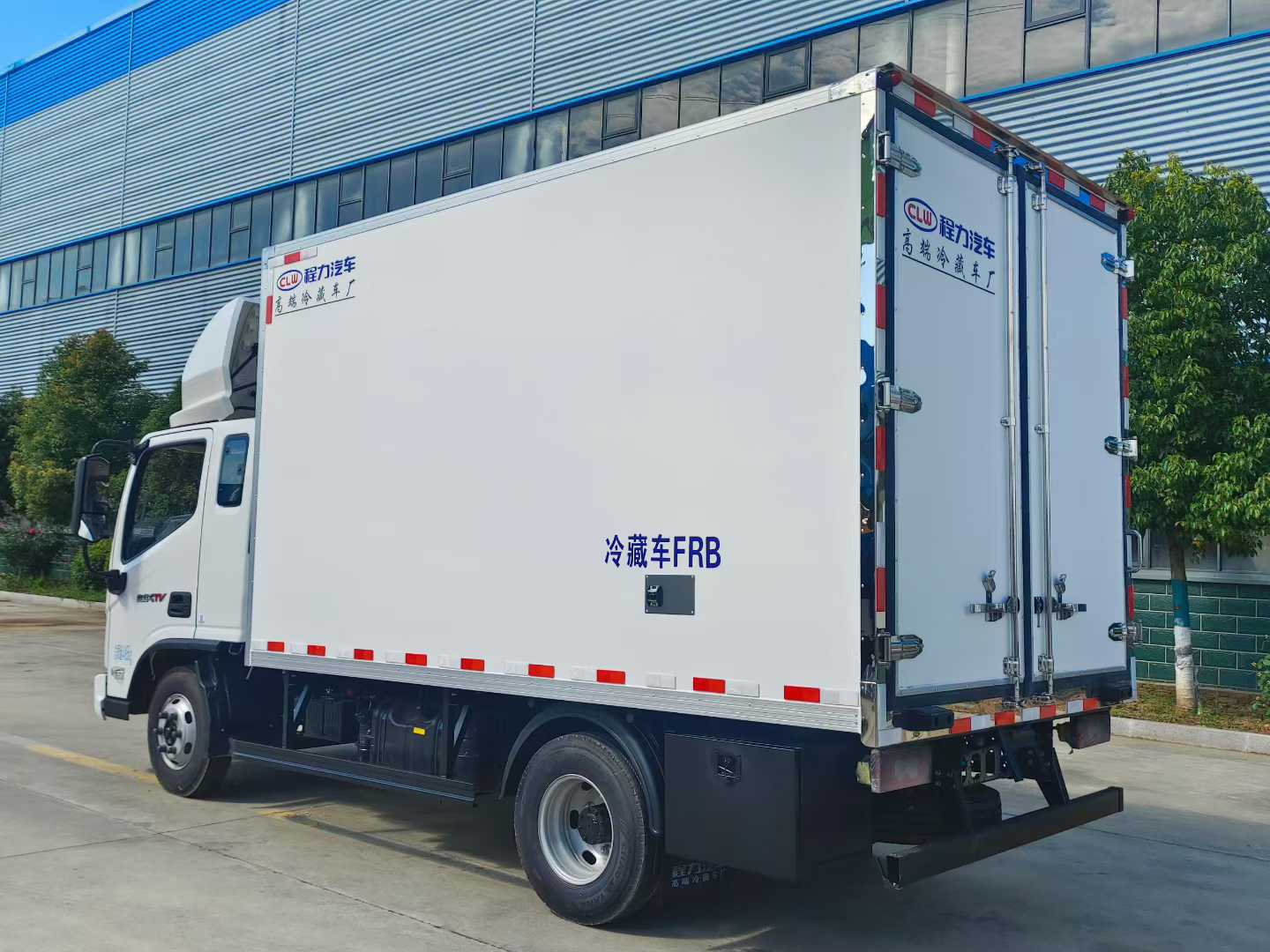 The box body is made of inner and outer fiberglass materials, with an 8CM thick insulation layer in the middle. It uses domestic large-scale negative pressure equipment for one-time molding. The bottom plate is made of 10CM thick reinforced and durable thickened board with anti-vibration and heat insulation properties. The four sides of the box body are wrapped with right-angle aluminum profiles. The rear door is covered with stainless steel, equipped with stainless steel lock pieces, aluminum profiles, and a glass fiber decorative panel on the floor. A single-sided door is provided.