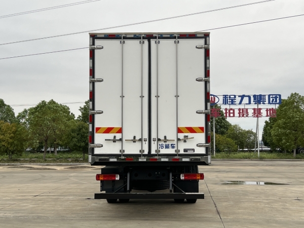 (3): The refrigerated truck body accessories: The box is surrounded by thickened aluminum alloy trim, stainless steel corner guards, stainless steel door locks and hinges, stainless steel lock parts and hinges, and energy-saving LED lighting inside the box.