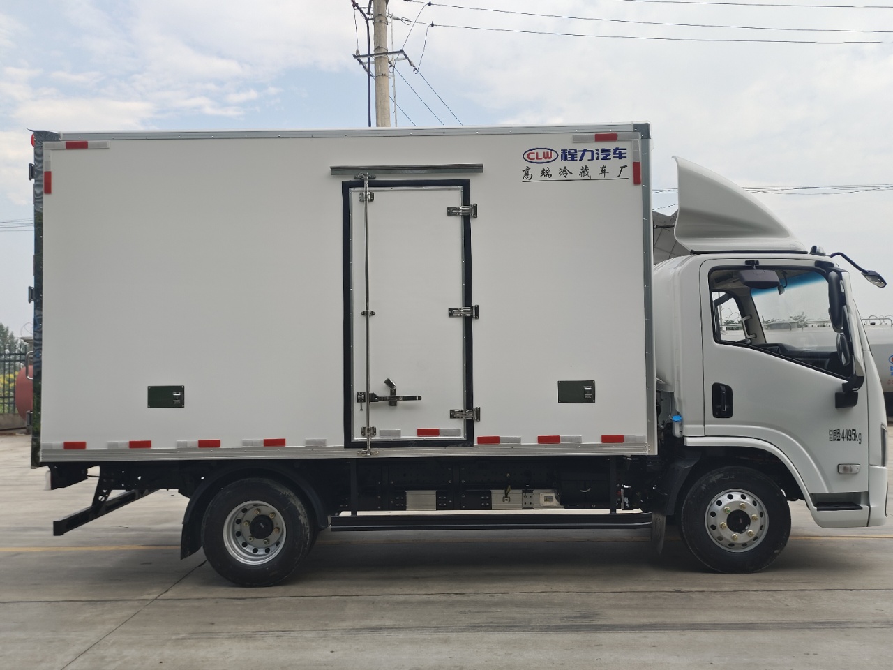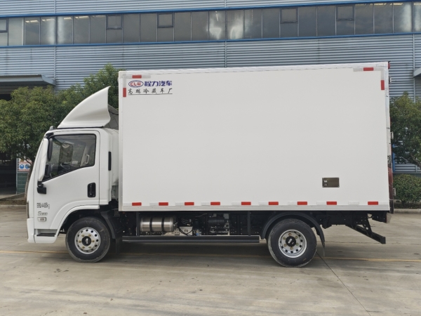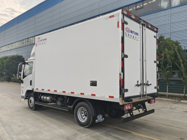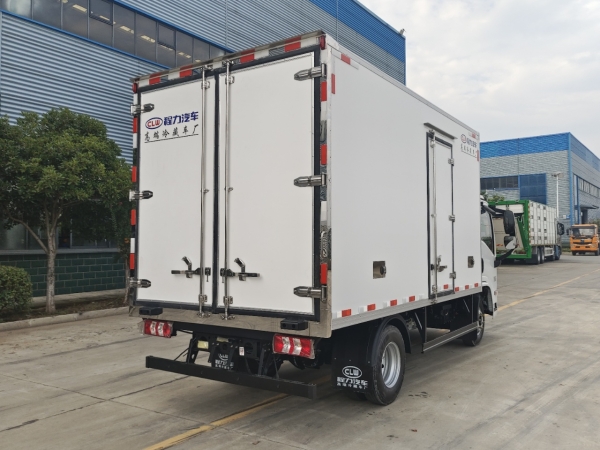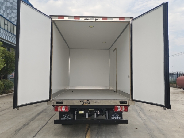 Truck dimensions: 4080 × 2100 × 2100 (mm). The body is made of inner and outer fiberglass materials, with an 8 cm thick insulation layer in the middle. The bottom of the box is made of anti-slip and wear-resistant fiberglass patterned board with 12 cm profile edge. There is 1 drainage outlet at the front. The sides of the box are wrapped with right-angle aluminum profiles, the rear door is stainless steel wrapped, and it opens on the right side. There are two ceiling lights inside the box.