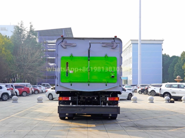 The truck has two sweeping discs in the middle and lower part, GTM high-pressure water pump (front flush/side spray/rear spray/side washing vehicle water gun/trash bin self-cleaning device), high-pressure roadside cleaning nozzle, Howe low-pressure pump, front spray, front flush, rear spray, rear sprinkler, carbon steel water tank (internal anti-corrosion), stainless steel trash bin, stainless steel high-pressure pipeline, German control Siemens electrical components, water tanks are all equipped with anti-overflow or low water level alarm devices; indoor monitor for reversing and washing and sweeping status, 18m high-pressure washing reel, maximum sweeping width 3.5m; washing pressure 10Mpa, suction particle size 120mm. Tail LED arrow light.