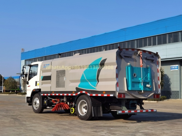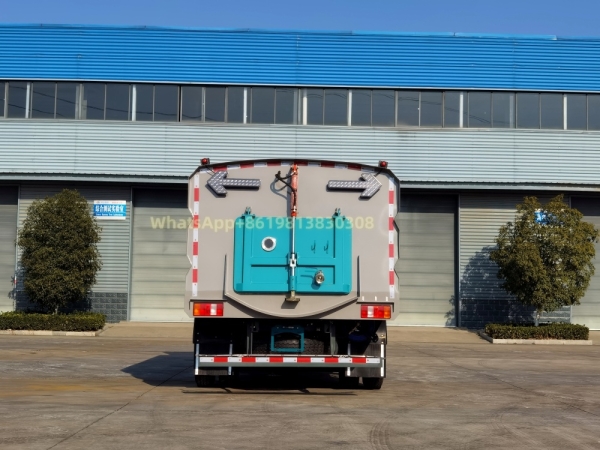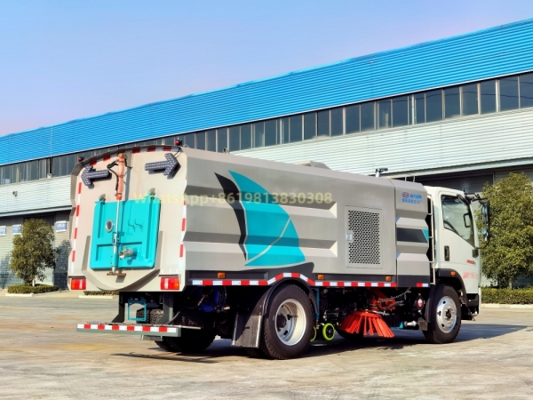 Cummins 140 auxiliary engine, Changshun automatic clutch, the same maintenance-free fan as Zoomlion, Hyderival solenoid valve group, German imported high-pressure pump, universal high-pressure curb cleaning, wear-resistant hydraulic cylinder, Siemens electronic control switch, left and right, rear spray dust suppression system, stainless steel trash bin and carbon steel water tank electrophoresis anti-rust treatment, water tank capacity of about 5 cubic meters, trash bin capacity of about 4 cubic meters, maximum cleaning width of about 3.2 meters, two front sweeping discs, middle suction cup, manual pump emergency system, multiple voice alarm tail arrow lights. The vehicle is equipped with low-pressure washing, front flushing, rear sprinkling and high-pressure washing functions (front curb washing/middle flushing/20 meters high-pressure washing reel/rear spray/trash bin self-cleaning) and tail arrow operation lights.
