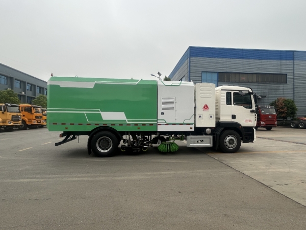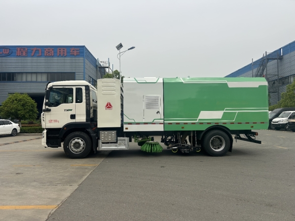 The road sweeper truck is equipped with high-pressure flushing function, 20m automatic positioning high-pressure washing drum, garbage bin self-cleaning device and overflow prevention device,