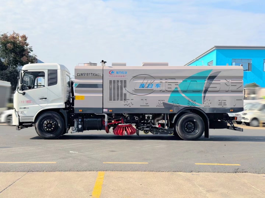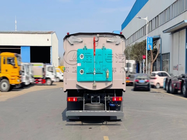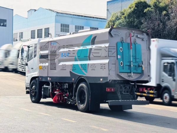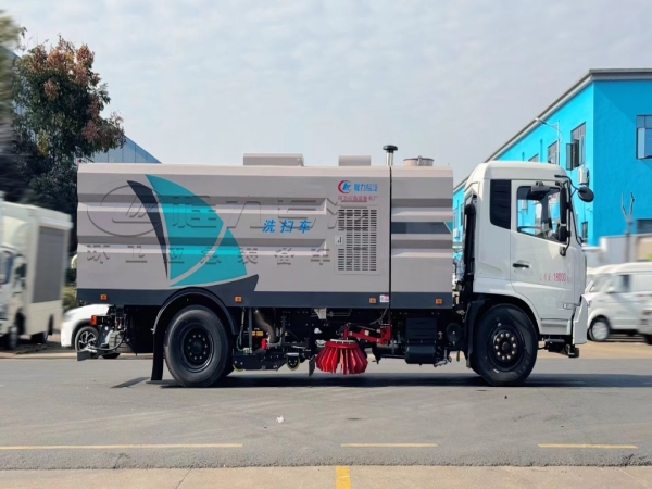 Cummins 170hp auxiliary engine, centrifugal fan, Bortop high-pressure water pump, water tank (10m3), garbage bin (7m3), mid-mounted left and right vertical sweeping devices, wide suction nozzle with water spray rod, low-pressure flushing system, sweeping disc dust suppression system, hydraulic system, dedicated device electronic control system and sub-frame. Equipped with Linton motor, Hypermix electromagnetic valve, Hypermix cylinder, high-pressure front angle spray, high-pressure rear spray, high-pressure reel, high-pressure curb cleaning nozzle, low-pressure front impact, stainless steel garbage bin, high-pressure self-cleaning of garbage bin, stainless steel pipe high-pressure pipeline, CAN bus control + tail operation box, LED arrow lights, garbage bin and water tank with overflow low water level alarm device, visual imaging.