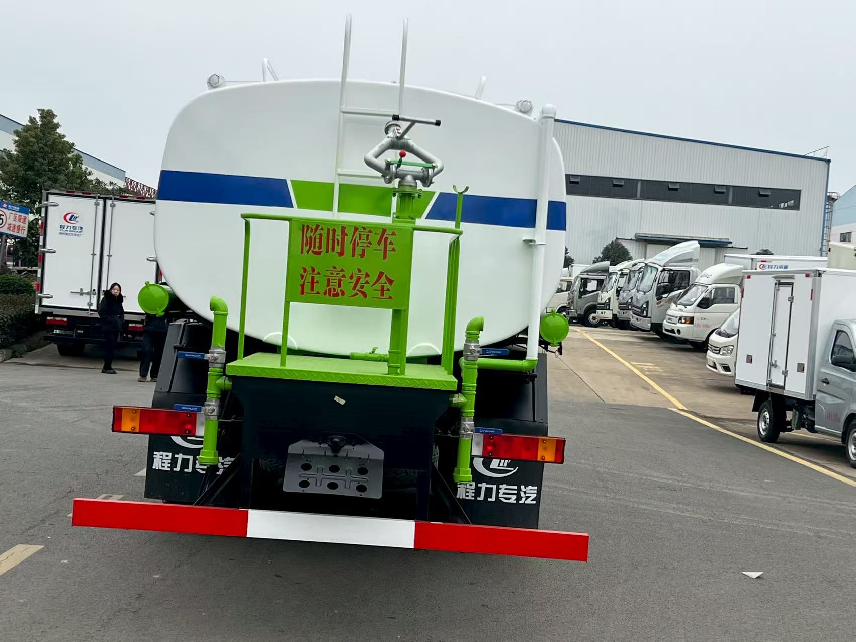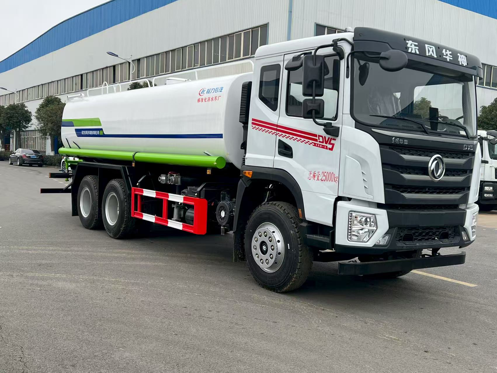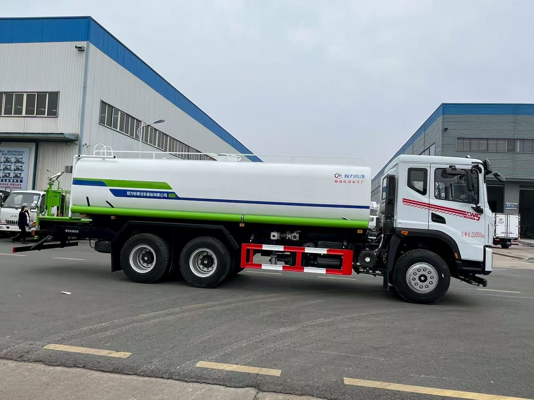 Dongfeng Huashen 20m3 water spraying truck body configurations: New 3.0 version coating, tank volume 20m3, tank material Q235, partition thickness 4mm, tank carbon steel thickness 5mm, head thickness 5mm. Large